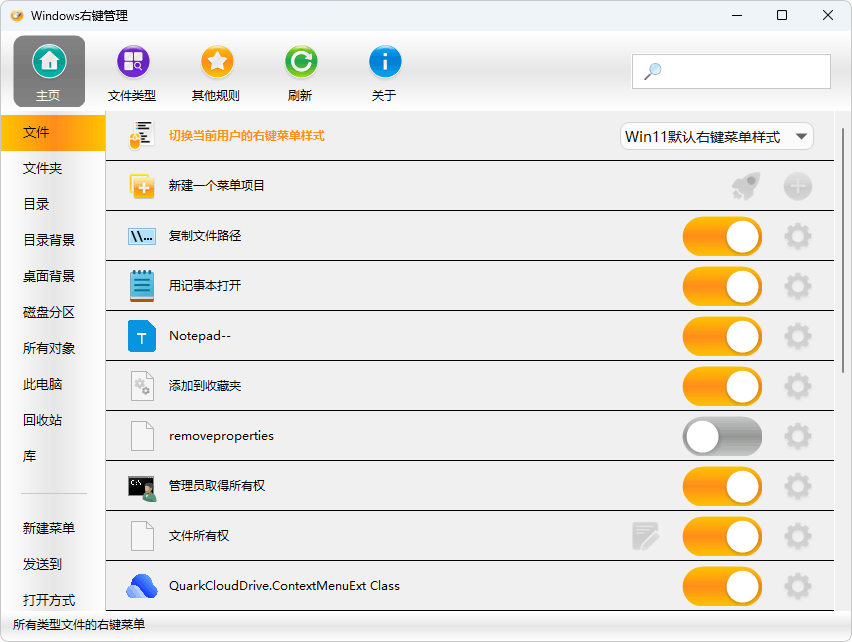 启用或禁用文件、文件夹、新建、发送到、打开方式、自定义文件格式等右键菜单项目