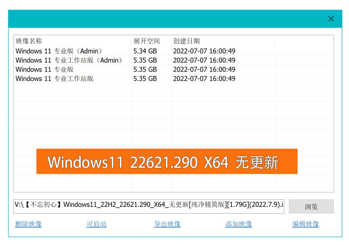 文件名: V:\【不忘初心】Windows11_22H2_22621.290_X64_无更新[纯净精简版][1.79G](2022.7.9).iso