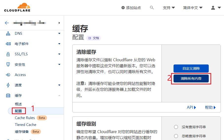 4. 点击导航的“缓存”- 点击切换到“配置”- 点击清除缓存中的【清除所有内容】。