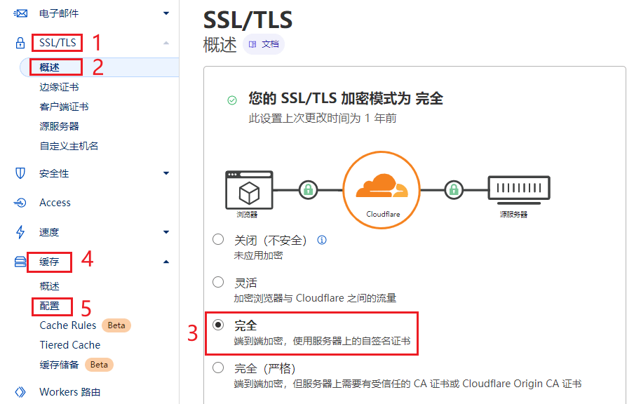 3. 点击左边导航的“SSL/TLS”- 点击选择“完全”或“完全(严格)”。