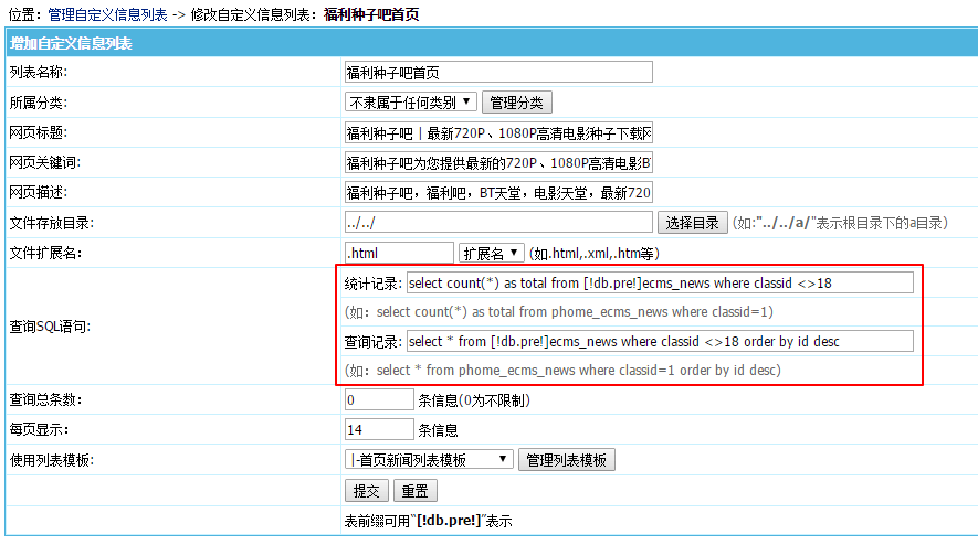 然后 后台– 栏目–自定义列表–管理自定义列表-首页列表-修改: