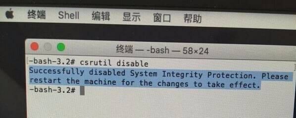 3.输入命令csrutil disable关闭。  如需要打开,同样的步骤输入命令csrutil enable