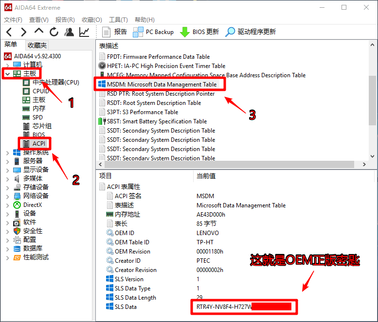 首先下载aida64这个软件,打开软件,然后依次打开主板————ACPI————MSDM,SLS Data后面的字符串就是内置Key啦。