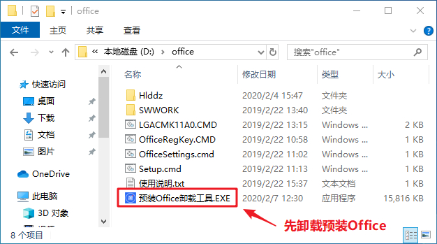 1、请确保原系统没有APP(应用商店)版Office,如果有,请先使用“预装Office卸载工具.EXE”进行卸载,然后重启电脑;