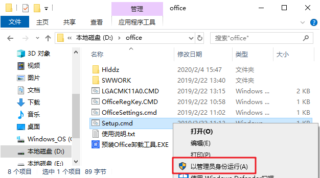 2、系统下使用管理员身份运行setup.cmd进行安装Office。(运行后全程Shell模式下自动安装,无需手动操作。)