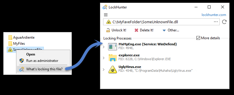 LockHunter(解锁猎人)文件解锁工具,文件强制删除工具,支持Windows所有版本,可以方便的通过资源管理器右键解除被锁定占用的文件,从而轻松删除被锁定的文件或文件夹,什么是锁定的文件和文件夹?就是无法删除的文件和文件夹,删不掉是因为有些程序正在读写这些文件,从而导致无法删除相关程序。