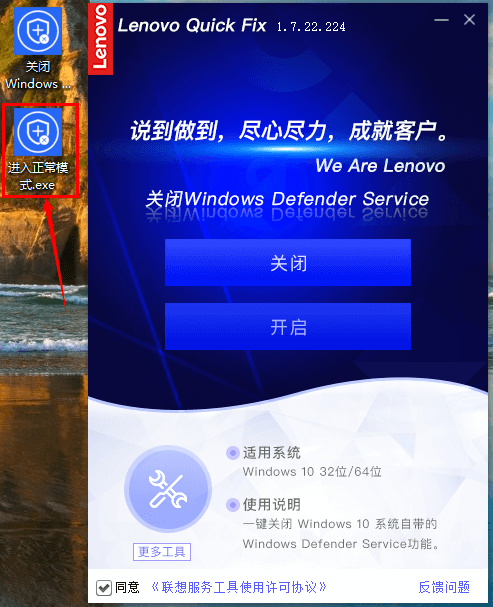 在安全模式下再次打开“关闭Windows Defender Service工具”,执行“关闭”,关闭成功后系统会自动重启到正常模式中,如下图: