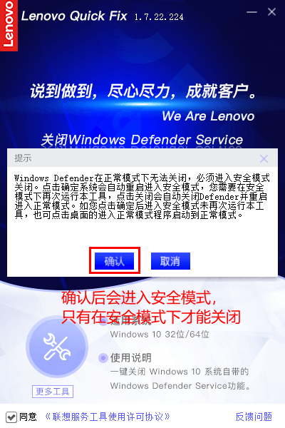 点击“关闭”后需注意提示信息即:关闭Windows Defender需在“安全模式”下进行,如下图:
