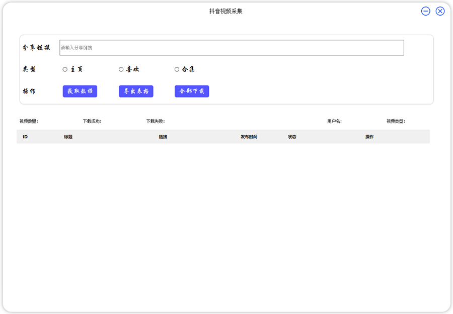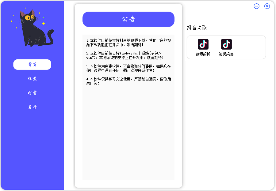 目前支持的功能:抖音视频解析(支持批量)、抖音 主页、喜欢、合集采集