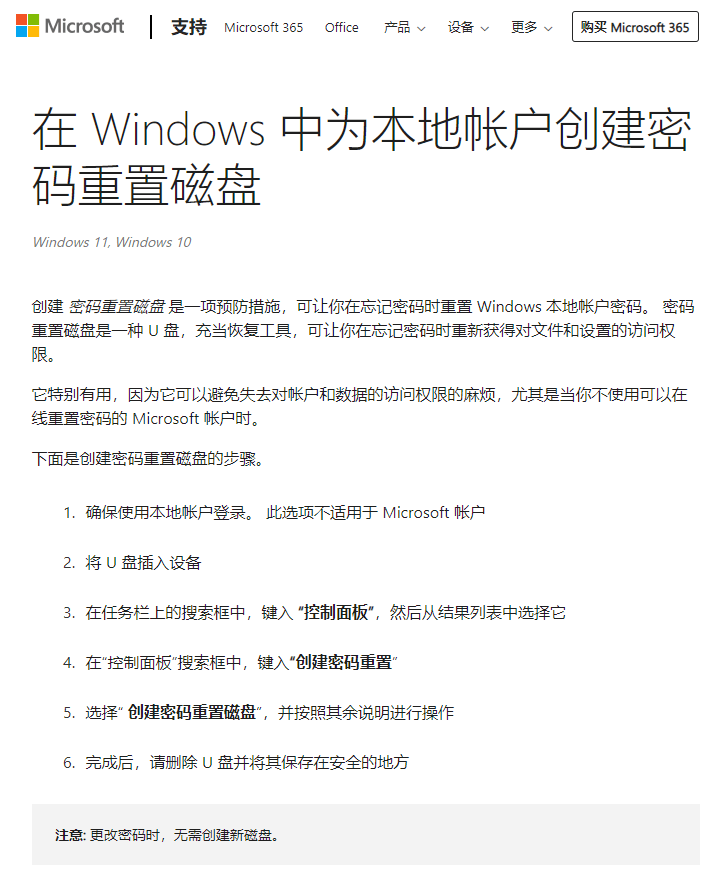 最近微软发布了一篇文章「在Windows中为本地账户创建密码重置磁盘」,其目的是防止忘记密码后,仍然能够登录Windows系统(本地账户),该方法需要用到一个U盘,用来保存密码,即密码重置磁盘,以下是官网提供的操作步骤。