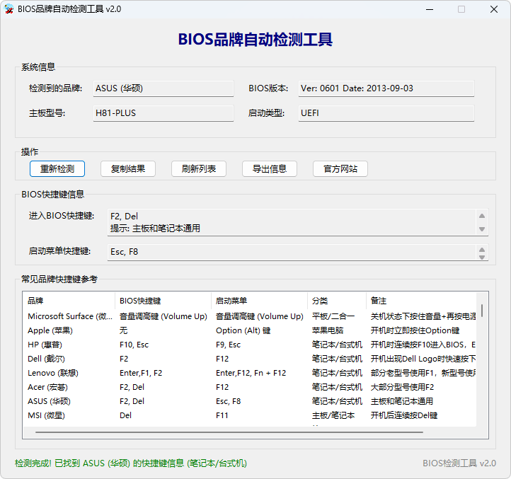信息全面:不仅能检测出 BIOS 品牌和版本等基础信息,还涵盖了主板型号、启动类型、快捷键等多方面的实用信息,为用户提供一站式的 BIOS 信息查询服务。