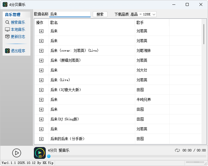 4分贝音乐是一款免费的音乐搜索下载软件,可试听,还可下载128K、320K和无损品质的歌曲,支持本地管理和播放(单循环、整体循环、随机模式)。