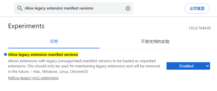 chrome升级到v139版本后,发现旧插件无法使用,而且也没有更高的插件版本,因为v139起插件的开发规则升级到Manifest V3,所以只要开启向下兼容即可。